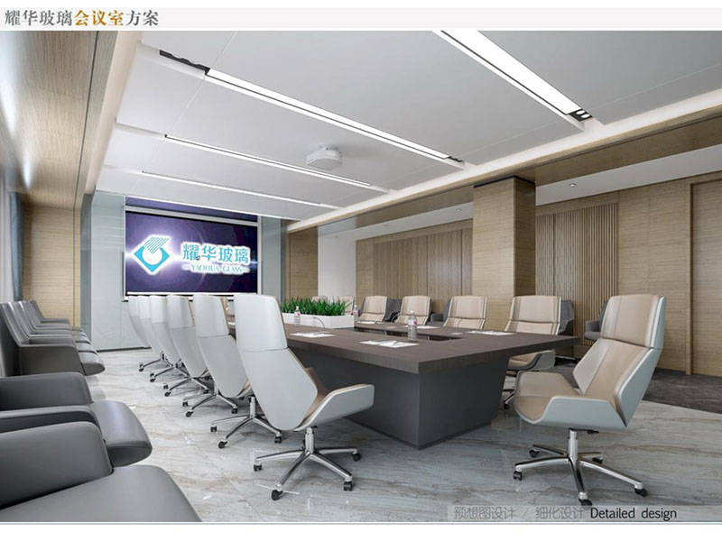 高檔會(huì)議室頂部燈光設(shè)計(jì)時(shí)要在天花板上安裝L型框架,三基色燈一般安裝在會(huì)議室天花板上。燈管裝置在L型框架拐角處,使燈光不直接照射到物體及與會(huì)者,而依靠天花板對燈光的反射、散射照亮?xí)h室。